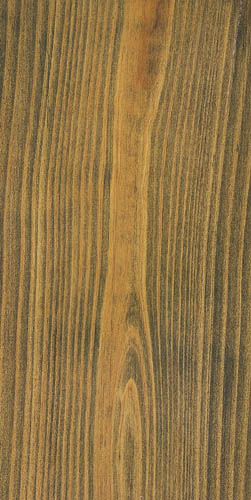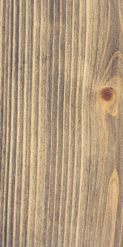 針葉樹材は中間的濃度の着色を施すと色ムラを起こしやすい。吸込みムラを生じにくくするために顔料着色剤が使われるが、なかでも白色顔料は吸込みムラを生じさせない。この見本では淡い材色とマッチさせるため、白と黒の顔料でグレーに調色し、素地着色を施している。中間的濃度の仕上げとしては代表的な着色法である